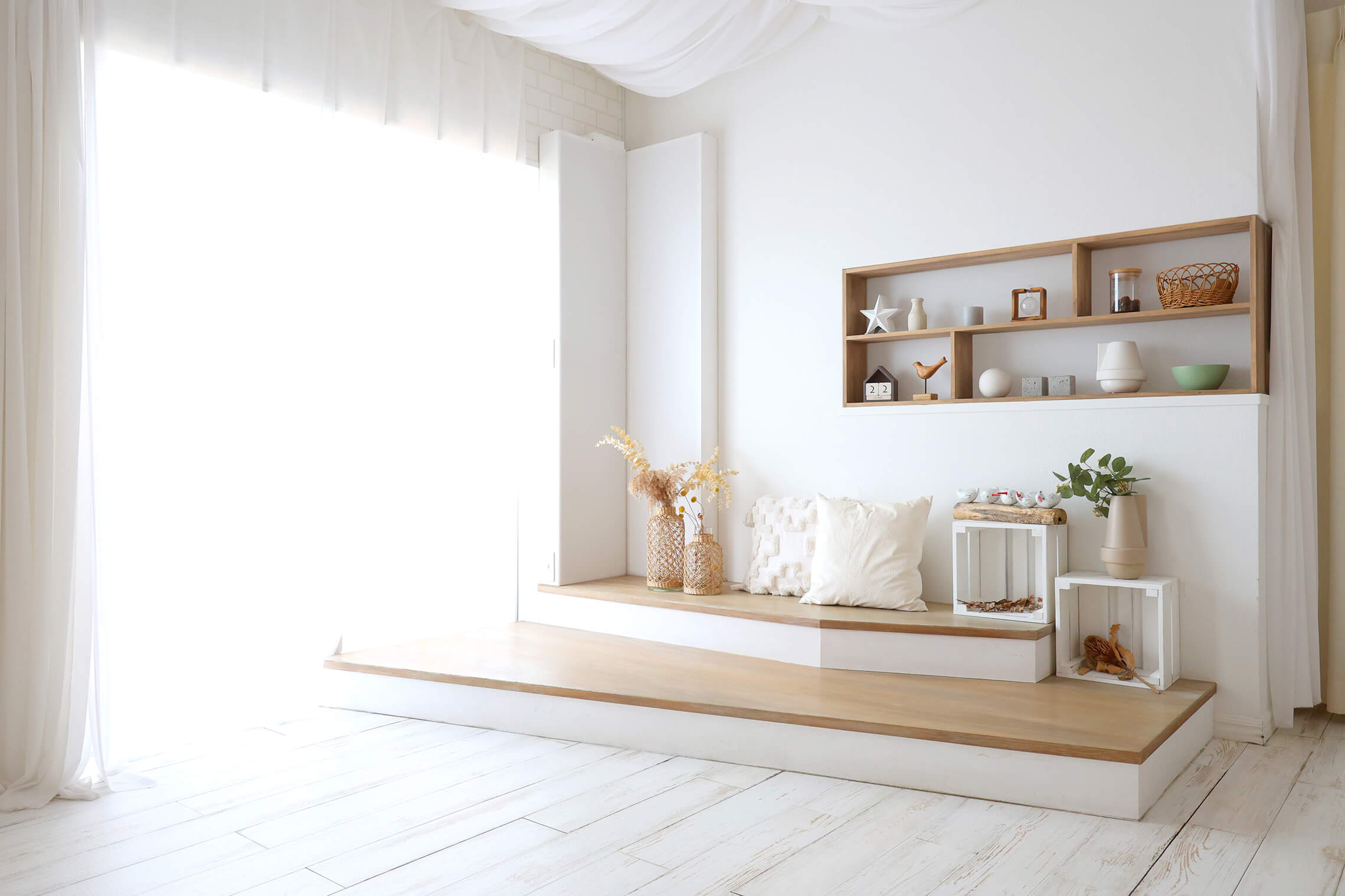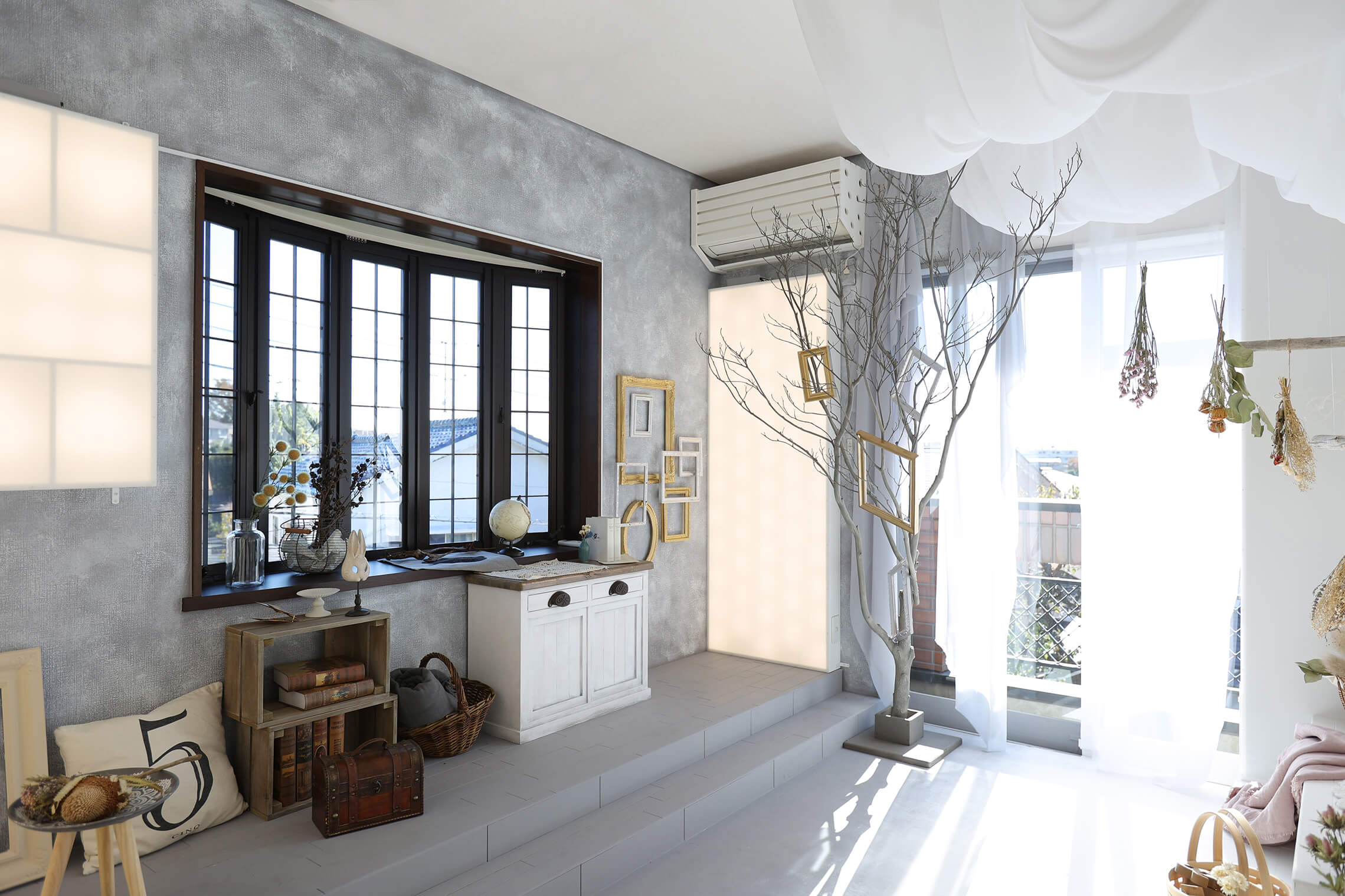 メインは白とウッドのナチュラルなスペースと、グレーの床にマットブラウンの壁という2つのテイストで構成。