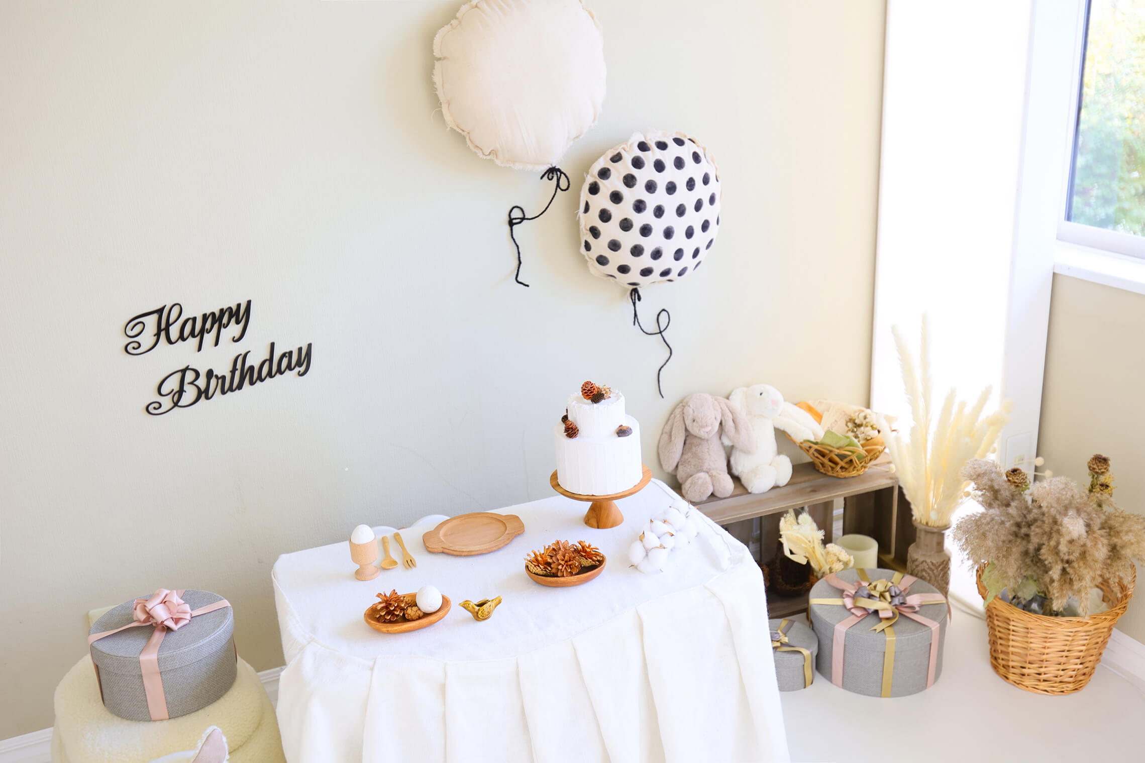 お誕生日写真のアイテムはあえてシックなものをチョイス。落ち着いた雰囲気がいっそうおしゃれな写真に。